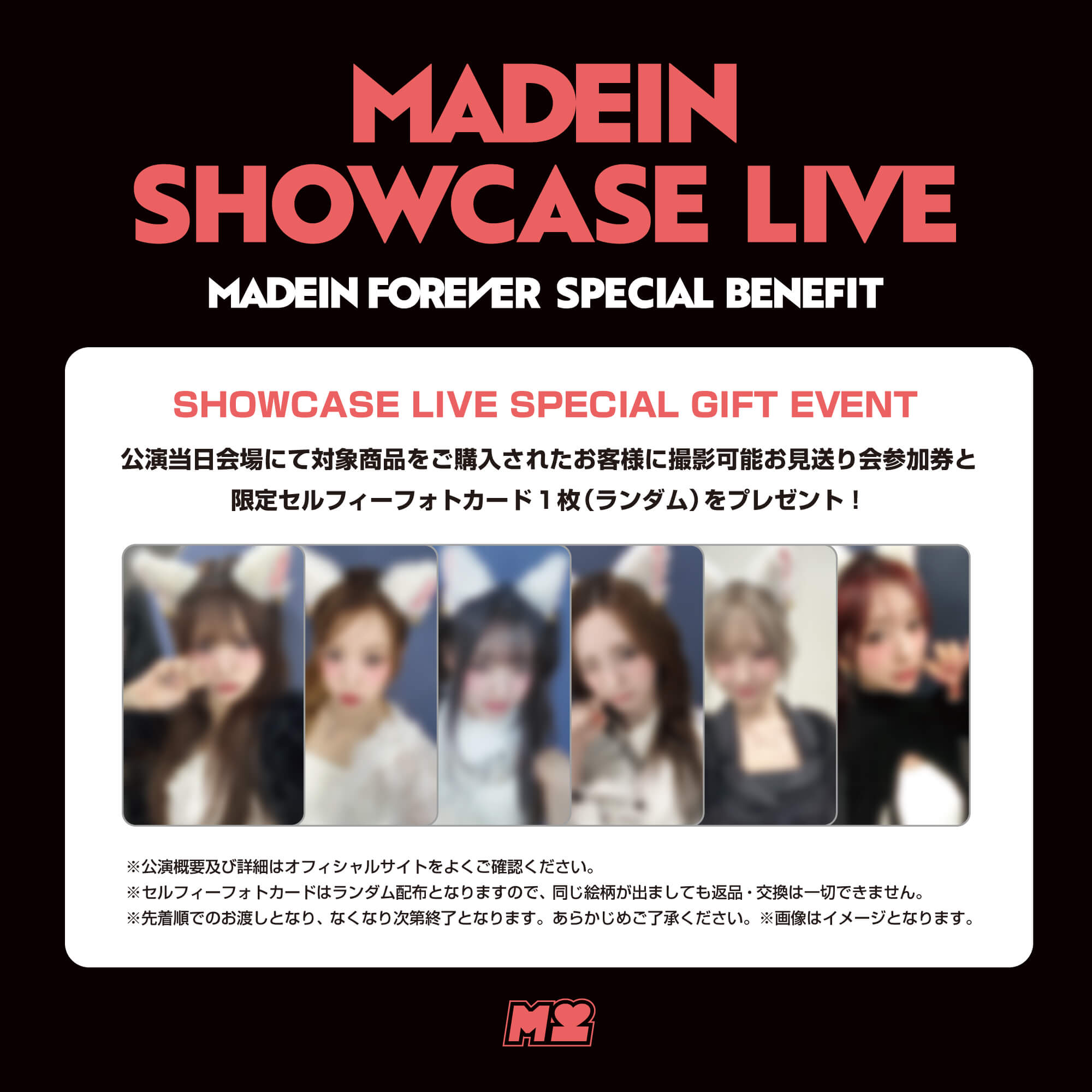 「MADEIN SHOWCASE LIVE」公演会場で対象商品「MADEIN FOREVER」をご購入いただいたお客様に、当日参加可能な撮影可能団体お見送り会参加券(各部500名様)&限定絵柄セルフィーフォトカードをプレゼントいたします!